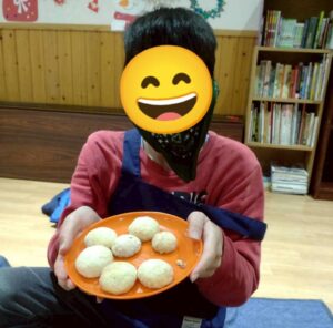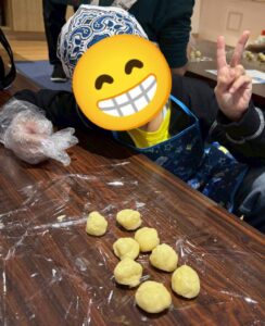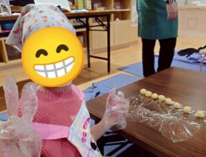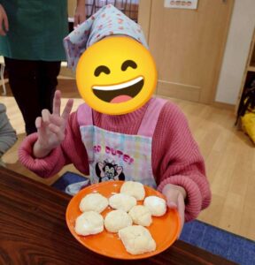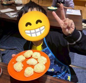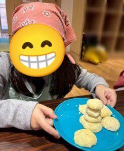 いよいよクッキーの焼き上がりです!自分のクッキーに粉糖をまぶしたら、スノーボールクッキーの完成!感想を伝え合いながらおいしそうに食べている子ども達でした!