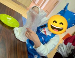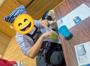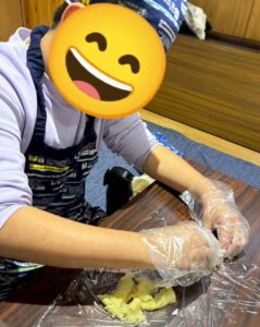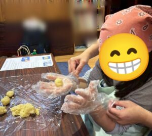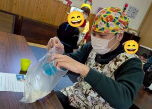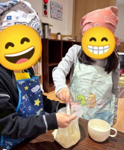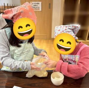 スノーボールクッキー作りでは、1人1つの生地をつくる所からスタート!生地の材料を袋に入れ、袋の上から材料をこねていきます。こねた時の生地の感触も楽しみながら取り組みました!