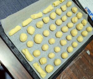 今回はクッキーの生地を小さくちぎって、団子状に丸める形を基本としました。お子さんによって、クッキーが大きくなったり小さくなったりと、個性豊かなクッキーの形ができました!